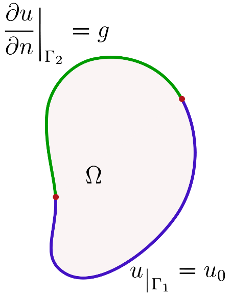 Rozwiązanie równania różniczkowego cząstkowego u w domenie Ω z granicą ∂ Ω spełnia mieszany warunek brzegowy, jeśli zawierając granice ∂ Ω dwóch rozłącznych części obszaru Г1 i Г2 (przy założeniu, że ∂Ω = Г1UГ2 ) u wyraża się następującymi równaniami: