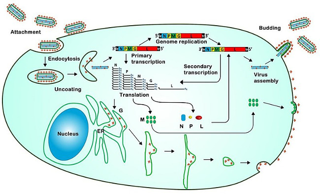 Nukleokapsyd przenika do wnętrza komórki na drodze endocytozy; zachodzi trawienie kapsydu prowadzące do uwolnienia kompleksu rybonukleoproteinowego (RNP) do cytoplazmy. Zachodzi tu replikacja genomu przy udziale polimerazy RNA zależnej od RNA wykorzystującej jako matrycę nić wirusowego RNA. Nowe kopie RNA pełnią również funkcję mRNA uczestniczącego w translacji białek nukleokapsydu (zachodzącej na wolnych rybosomach) oraz glikoprotein osłonki (zachodzącej w retikulum endoplazmatycznym i aparacie Golgiego). Składanie nukleokapsydu zachodzi w cytoplazmie; otoczenie nukleokapsydu przez osłonkę lipidową z wypustkami glikoproteinowymi następuje w trakcie przechodzenia potomnych cząstek wirusa przez błonę komórkową. Nowe wiriony uwalniane są z zakażonej komórki na drodze pączkowania, a następnie przemieszczają się zstępującymi włóknami nerwowymi do serca, mięśni szkieletowych, rogówki oka, trzustki, nadnerczy i ślinianek. Cząstki wirusa obecne w ślinie stanowią potencjalne źródło zakażenia innych zwierząt i człowieka.