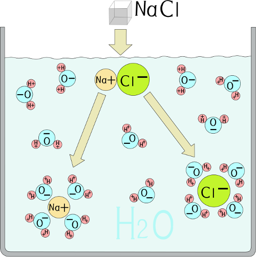 Woda, dzięki polarnej budowie swych cząsteczek i zdolności tworzenia wiązań wodorowych, stanowi uniwersalny rozpuszczalnik związków jonowych (np. soli, kwasów, zasad) i polarnych związków drobnocząsteczkowych (np. cukrów prostych, dwucukrów, alkoholi); w wodzie rozpuszczają się również związki wielkocząsteczkowe posiadające na swej powierzchni hydrofilowe regiony jonowe i polarne (np. białka, wielocukry). Właściwość ta ma istotne znaczenie w transporcie składników odżywczych (np. cukrów, soli mineralnych, witamin) w sokach roślinnych bądź płynach ustrojowych zwierząt. Rozpuszczanie związków jonowych (np. chlorku sodu, NaCl) w wodzie polega na elektrostatycznym przyciąganiu jej polarnych cząsteczek przez jony wykazujące zdolność tworzenia z nimi wiązań wodorowych. Regiony tlenowe cząsteczki wody posiadające częściowy ładunek ujemny (δ-) przyciągane są przez dodatnio naładowane kationy sodowe (Na⁺); regiony wodorowe mające częściowy ładunek dodatni (δ+) przyciągane są przez ujemnie naładowane aniony chlorkowe (Cl⁻). W wyniku tych oddziaływań pojedyncze kationy sodu i aniony chlorkowe otaczane są przez powłoki hydratacyjne utworzone z cząsteczek wody. Jony te są następnie sukcesywnie usuwane z sieci krystalicznej soli do momentu całkowitego rozpuszczenia jej kryształu, czyli powstania jednorodnego roztworu kationów sodu i anionów chlorkowych rozpuszczonych w wodzie.