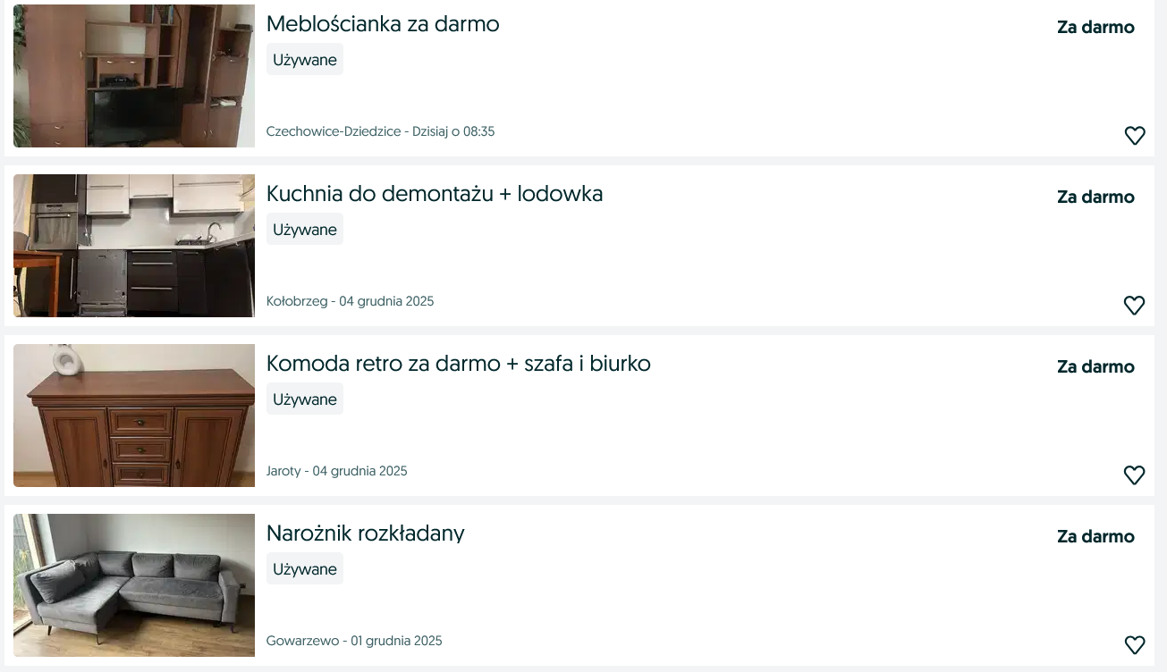 Przeglądając ogłoszenia, można odnieść wrażenie, że Polacy oddają wszystko, co tylko da się wynieść z mieszkania. Wśród najczęstszych kategorii pojawiają się: