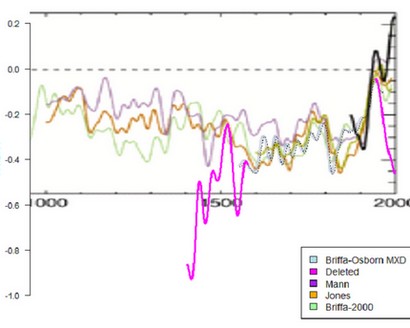 Inną metodą było ukrywanie spadku pomiarów temperatur w owym okresie, które Steve McIntyre określa sztuczką pt. „ukryć spadek”. Takie cuda działy się w komputerach Phila Jonesa i Keitha Briffa. Jak widać zbierane dane nie pasowały do tezy, więc nieposłuszny wykres (na różowo), po prostu wykasowano…