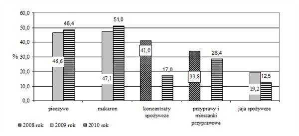 Porównując wyniki kontroli znakowania pieczywa i makaronów z wynikami kontroli z roku 2009, można stwierdzić, iż sprawy nie wyglądają najlepiej, bo procent partii pieczywa nieprawidłowo oznakowanego wzrósł o 1,8 p.p. (z 46,6 proc. w 2009 roku do 48,4 proc. w 2010 roku), a makaronu o 3,9 p.p. (z 47,1 proc. w 2009 roku do 51,0 proc. w 2010 roku). W pozostałych grupach skontrolowanych produktów (koncentratów spożywczych, przypraw i mieszanek przyprawowych oraz jaj spożywczych) można zauważyć tendencję spadkową liczby nieprawidłowo oznakowanych partii, w odniesieniu do wyników kontroli z lat 2008-2009.