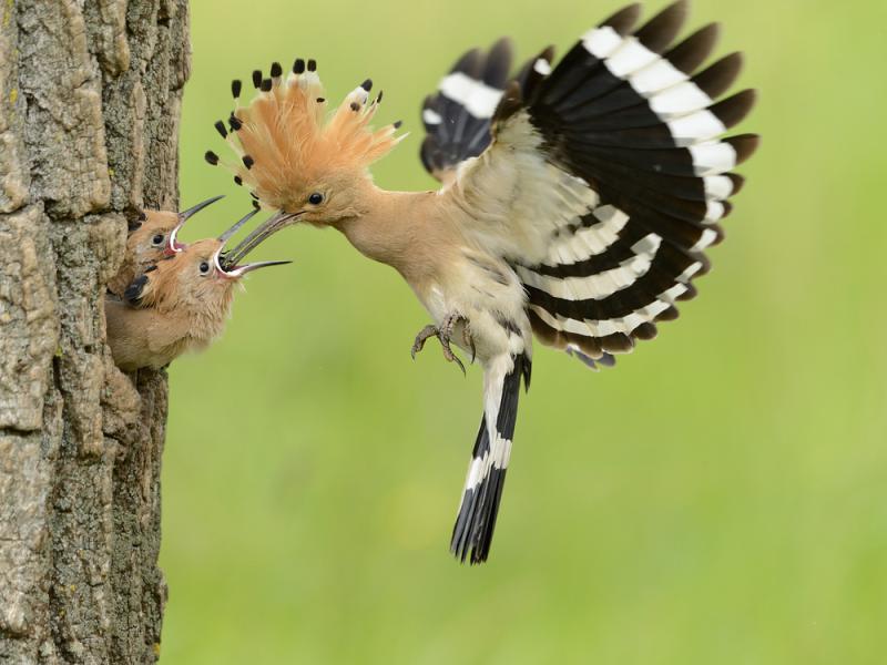Załóżmy jednak, że tym razem wygrały. Zazwyczaj na początku sezonu lęgowego samiec przystaje na takiej gałęzi, która zapewni mu słyszalność na daleką odległość! Nadyma wówczas swoje podgardle i próbuje zachęcać samice z okolicy do współżycia charakterystycznym “hup-hup-hup-hup”. Głos ten trudno pomylić z innym. Żaden z przedstawicieli naszej awifauny w żadnym calu nie emituje nawet podobnych brzmień! Kiedy już to rzeczone “hup-hup-hup-hup” oczaruje panią dudkową, wtedy ptaki zabierają się do budowy gniazda, o ile w przypadku dudka można o takowym mówić. Dobrze może przesadziłem, bo sowy czy sokoły są jeszcze bardziej leniwe, aniżeli nasz bohater.