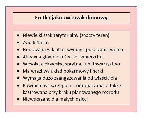 Patrząc na fretkę można by odnieść wrażenie, że będzie to doskonałym kompan dla dziecka. Niestety, rzeczywistość jest wręcz odwrotna. Eksperci nie polecają hodować tych sympatycznych zwierząt w domach z dziećmi do lat 12. Po pierwsze, ich zabawy mogą być dość agresywne – zdarzają się podrapania i ugryzienia, zwłaszcza, jeśli maluch próbuje się spoufalać z rozkosznym zwierzakiem. Poza tym, fretki żyją stosunkowo długo i wymagają ciągłego zaangażowania oraz opieki, a u wielu dzieci ochota na „zwierzątko” bywa tylko krótkotrwałym kaprysem – później odpowiedzialność spada na rodziców, a przy brak czasu pupil bywa często zaniedbywany.