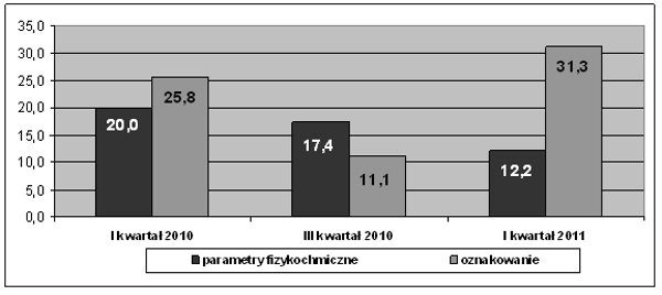 Wyniki kontroli w zakresie jakości handlowej przetworów rybnych (w tym konserw i marynat rybnych oraz ryb mrożonych), przeprowadzonej w I kwartale 2010 r. wykazały nieprawidłowości w zakresie parametrów fizykochemicznych w 20,0 proc. skontrolowanych partii, a grupą asortymentową najczęściej kwestionowaną były konserwy rybne – aż 30,8 proc. partii konserw rybnych skontrolowanych nie spełniało deklaracji producenta w przedmiotowym zakresie. Dla porównania w przypadku ryb mrożonych wykazano nieprawidłowości odnośnie 9,7 proc. skontrolowanych partii ryb mrożonych.
