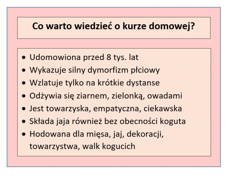Gallus gallus domesticus, albo, jak sugerują niektórzy naukowcy optujący za wielogatunkowym pochodzeniem kury domowej, po prostu G. domesticus, to średniej wielkości ptak o wyraźnym dymorfizmie płciowym. Koguty są znacznie większe i mogą ważyć nawet do 4 kg. Odróżnia je nie tylko rozmiar, ale przede wszystkim imponujący grzebień oraz korale – te czerwone zazwyczaj wyrostki mają tendencję do wypełniania się krwią i sztywnienia, co można uznać za formę koguciej erekcji. Znakiem rozpoznawczym jest też oczywiście ogon, który u niektóry ras sięga nawet 30 cm.