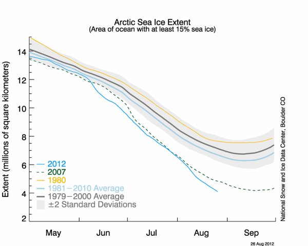 Już 13 sierpnia zasięg pokrywy lodowej był o 483 km2 mniejszy od tego z 2007 roku. W dniu 26 sierpnia powierzchnia lodu wynosiła 4,1 mln km2 i pobiła o 70 tys. km2 rekord sprzed 5 lat, a konkretnie z 18 września. Tempo ubytku lodu jest najwyższe dla tego miesiąca od czasu rozpoczęcia obserwacji satelitarnych w 1979 roku – poinformowało NSIDC.