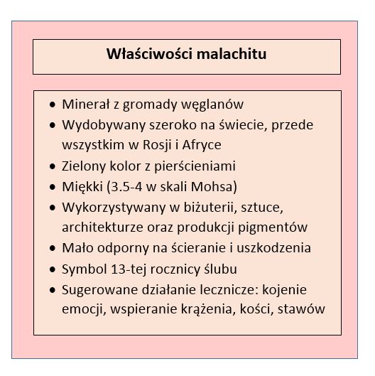 Tabela przedstawiająca właściwości malachitu; opracowanie własne Zastosowania malachitu