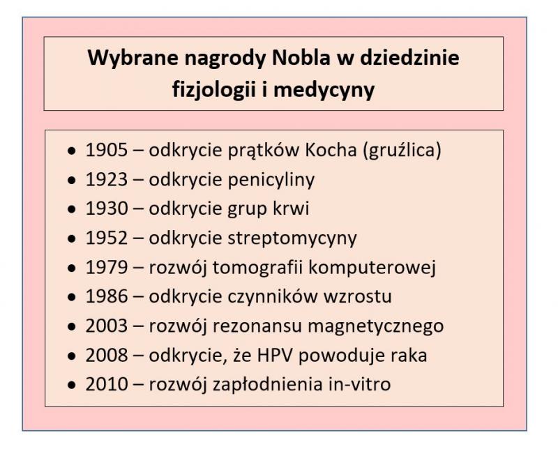 Bardzo wielu badaczy uhonorowano też Noblem za osiągnięcia w dziedzinie fizjologii i naszego rozumienia ludzkiego ciała. W 1904 r. nagrodę otrzymał słynny I.P. Pavlov za wkład w poznanie fizjologii układu pokarmowego, a w 1909 r. E.T. Kocher za pracę nad patologią i operacjami tarczycy. Ponadto najbardziej prestiżowe trofeum naukowe przyznane zostało również za odkrycie insuliny (1923), EKG (1924) oraz grup krwi (1930). W latach 40 XX w. do przełomowych osiągnięć zaliczono również odkrycie witaminy K, penicyliny oraz negatywnych skutków zdrowotnych napromieniowania RTG.