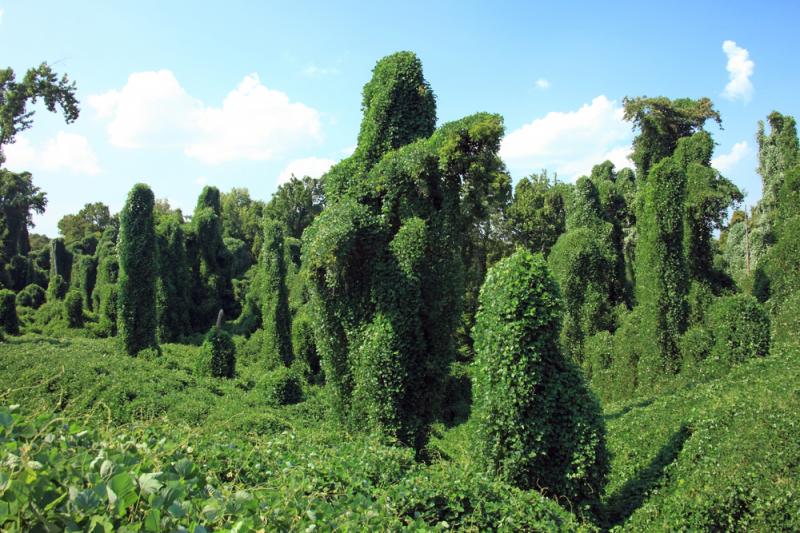 Kudzu (Pueraria montana) jest cenioną rośliną zielarską, od wieków stosowaną w medycynie chińskiej. Płodne pnącze okazuje się też być jednym z najpoważniejszych botanicznych intruzów na świecie. Pochodzi ono ze wschodniej Azji (Chin, Japonii i Korei), ale zostało rozwleczone niemal po całym świecie. Pomogły mu ssaki i ptaki przenoszące nasiona, a przede wszystkim człowiek. Pod koniec XIX w. kudzu zawitało do USA jako gatunek ozdobny, a później stało się głównym narzędziem walki z erozją gleby.