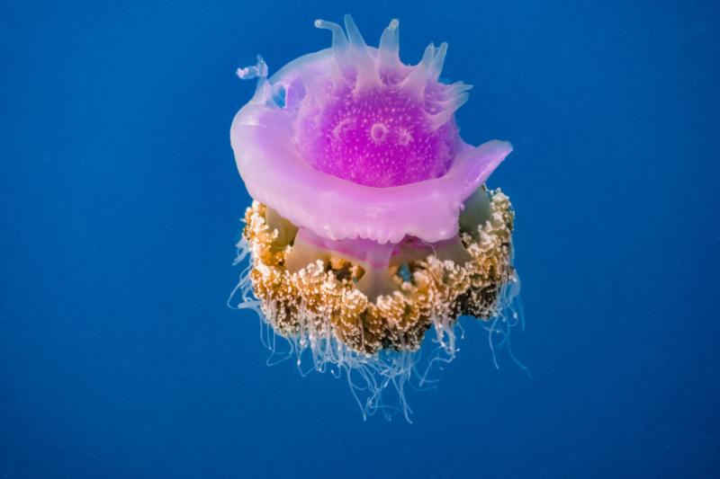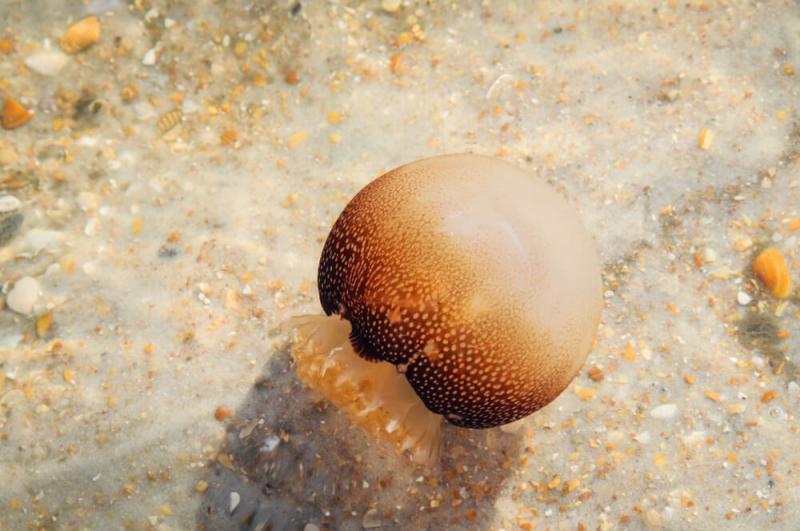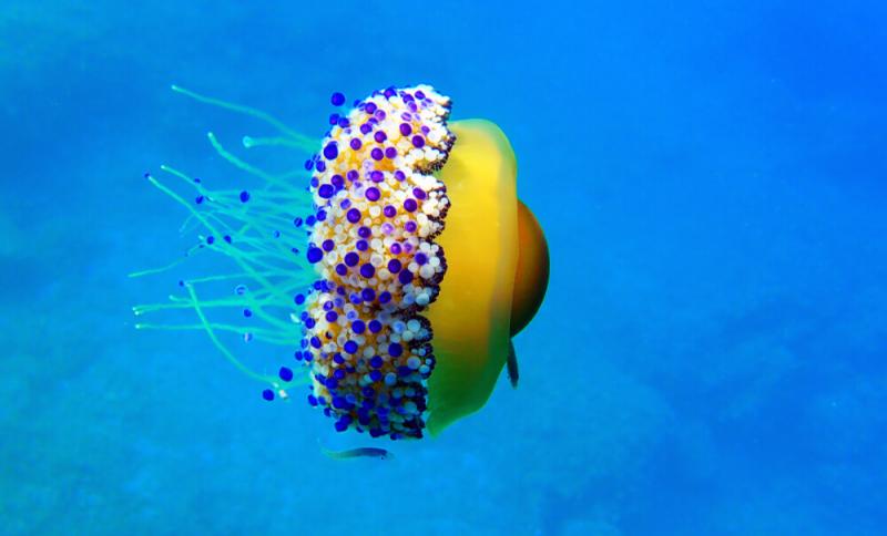 Znacznie bliżej nas, bo już w Morzu Śródziemnym, spotkać można wyjątkowo urodziwą meduzę Cotylorhiza tuberculata, o średnicy 17-40 cm. Na szczęście, nie jest ona groźna dla urlopowiczów – jedynie u wrażliwych ludzi wywołuje reakcje uczuleniowe. W języku angielskim nadano jej przydomek smażonego jajka ze względu na dość oryginalny dzwon pławny, który z góry często faktycznie przypomina żółtko otoczone białkiem i skwierczące na patelni. Prawdziwą ozdobą meduzy są jednak dość krótkie, fantazyjnie rozwidlone ramiona, które dzięki kolorowym, dyskowym zakończeniom wyglądają niczym spódniczka baletnicy. Jako ciekawostkę warto dodać, że Cotylorhiza tuberculata żyje w symbiozie z fotosyntezującymi glonami, które chętnie szukają schronienia w żelowym organizmie dostarczając w zamian za to swemu gospodarzowi energii.