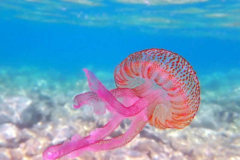 Niewielka, ale urocza – taka jest meduza świecąca (Pelagia noctiluca) spotykana w Północnym Atlantyku, Morzu Śródziemnym i Zatoce Meksykańskiej. Mierzące zaledwie 3-12 cm w średnicy organizmy są zazwyczaj fioletoworóżowe, różowe lub jasnobrązowe, z eleganckimi cętkami zdobiącymi transparentny dzwon pławny. Dość nieoczekiwanie gatunek ten posiada faktyczne macki przypominające odnóża ośmiornicy, które potrafią skutecznie i boleśnie poparzyć – choć nie są groźne dla zdrowia, ich nieprzyjemne skutki utrzymują się nawet przez kilka dni.