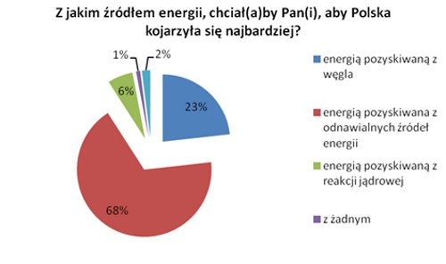 Wynika z niego, że 67 proc. Polaków chciałoby aby Polska kojarzyła się z odnawialnymi źródłami energii. Najwyższe poparcie dla zielonej energii deklarują mieszkańcy środkowo-wschodniej (85 proc.) oraz północno-wschodniej Polski (83 proc.). 23 proc. Polaków wolałoby jednak aby nasz kraj kojarzony był ze spalaniem węgla. Najliczniejszą grupę (34 proc.) stanowią tutaj zamieszkali na południu kraju. Zaledwie 6 proc. obywateli jako znak rozpoznawczy Polski chętnie widziałoby energetykę jądrową.