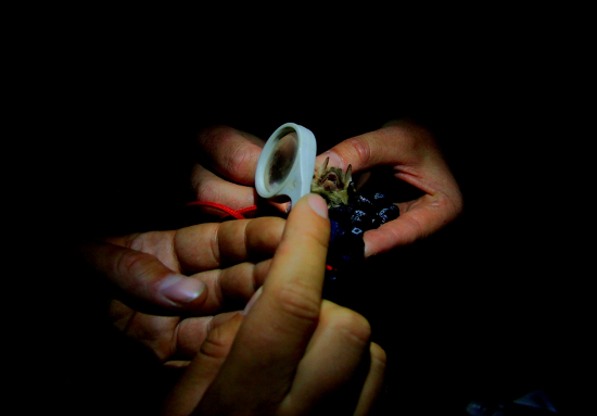 Po jakiś 10 minutach Paweł przyszedł z workiem i odsieczą. Przytrzymał nietoperza i raz, dwa wyjął ssaka z sieci. Właściwie nawet nie jestem w stanie opisać jak to zrobił, bo tak szybko to nastąpiło. Razem z małym latającym owadożercą wróciliśmy od obozu.