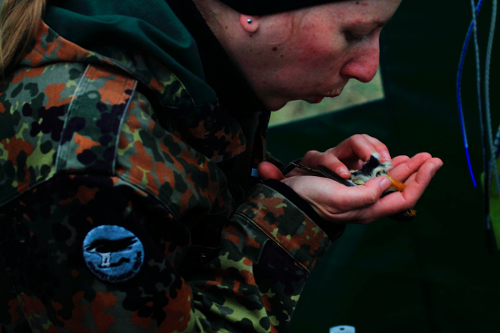 Paweł rozpalił „kozę”, punkt centralny namiotu kuchni. „Koza” nie jest zwykłym piecykiem. Właściwie to tylko Paweł trudnił się uzupełnianiem drewna. Tylko on wiedział na co „koza” ma ochotę i jak ją zachęcić, by to coś spaliła. W namiocie zrobiło się ciepło. Każdemu było bardzo przyjemnie. Ale cóż czas nocnego obchodu nadchodził nieubłaganie. 22:00 – pora iść. Paulina wzięła woreczki, założyła czołówkę, dała mi smycz z karabińczykiem i w drogę. Wziąłem ze sobą reflektor. Ależ on świecił. W tych ciemnościach było widać naprawdę wszystko, a może jeszcze więcej? Pierwsze dwie sieci były puste, poszliśmy do „drozdówki”, a nuż jakiś drozd się złapał. Zwykle Gosia narzekała, że na w „drozdówkę” mało ptaków wpada. Drozdy omijały ją i o wiele częściej wpadały w sieci przeznaczone dla mniejszych ptaków, a także większych. Wiele razy kosy czy kwiczoły były wyciągane z tzw. „drapolówki” – nietrudno się domyślić, że ta sieć posiada na tyle duże oka, by w miarę łatwo wyplątać z niej jakiegoś drapieżnika.