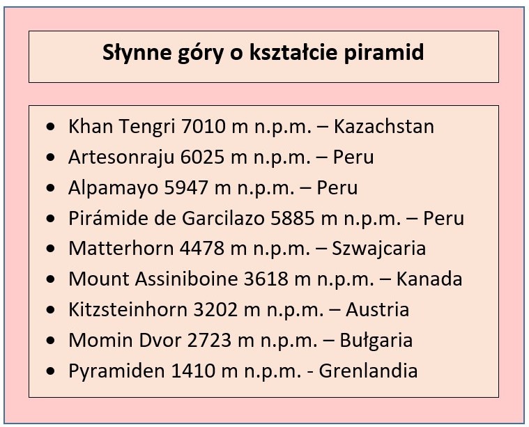 Tabela przedstawiająca słynne góry o kształcie piramidy; opracowanie własne
