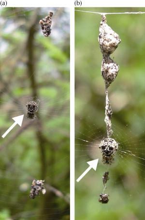 Arachnolodzy od dawna zauważyli, że wiele gatunków pająków wplata w swoje sieci łowne misterne wzory a nawet suche listki, źdźbła traw, martwe owady czy ich jaja. Jest to z jednej strony swoisty podpis właściciela sieci, a z drugiej lepsze zamaskowanie sieci w otoczeniu. Biolodzy Ling Tseng i I-Min Tso postanowili przyjrzeć się bliżej zwyczajom kilku pająków z rodzaju Cyclosa. Okazało się, że pająki wcale nie wplatają suchych fragmentów roślin w pajęczynę przypadkowo. Z pewnej odległości ta swoista ozdoba budowana przez pająka do złudzenia przypomina jego samego.