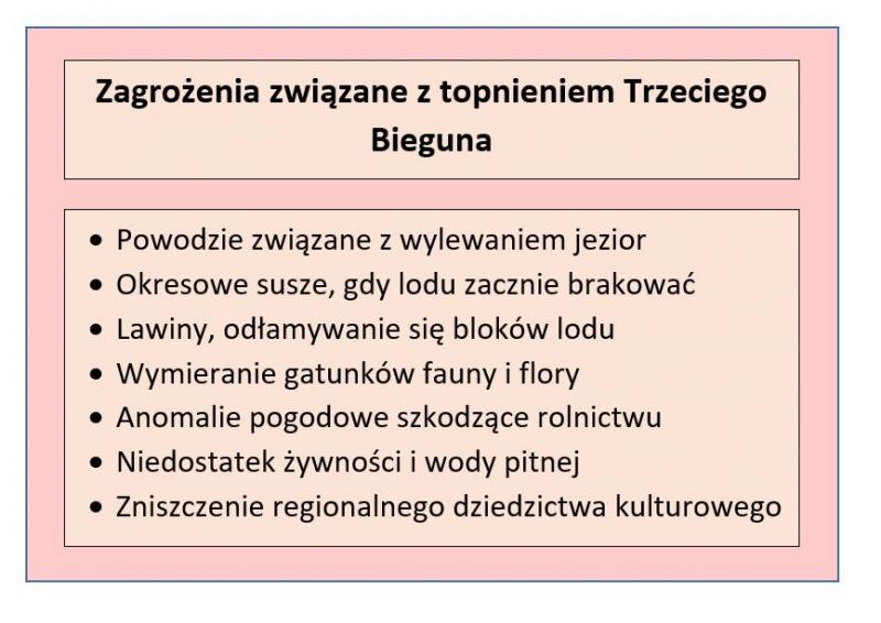 Topnienie Trzeciego Bieguna analizowane jest pod kątem czterech zasadniczych typów ryzyka: powodzi, utraty gatunków i całych ekosystemów, degradacji warunków życia ludności oraz zniszczenia kulturalnego dziedzictwa związanego m.in. z Tybetem.