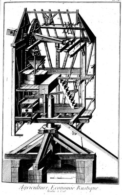 I tak oto dotarliśmy do serca omawianej budowli, czyli do jego części produkcyjnej, która znajduje się na najwyższej – zwykle trzeciej – kondygnacji. Umieszczone tu są kamienie młyńskie z koszem zasypowym, a także jest tu miejsce na zajmujący przestrzeń poddasza wał skrzydłowy, zamieniający energię wiatru na pracę rozmaitych mechanizmów. Przede wszystkim osadzone na wale koło palczaste przenosi wraz z cywiem (małe koło ze szczeblinami poruszające kamień młyński) ruch obrotowy poziomego wału na pionową oś kamienia młyńskiego. Grubsza część wału (głowa) wystaje poza lico ściany przedniej. W owej głowie – wykonanej niekiedy z metalu – zamocowane są skrzydła. Cztery łopaty (śmigi) skrzydeł mają konstrukcję szkieletową, co umożliwia – poprzez nakładanie lub zdejmowanie płóciennych fartuchów – regulowanie siły parcia wiatru na śmigi. Tak więc w przypadku słabych powiewów zakrywano całą powierzchnię łopat, aby “złapć” więcej wiatru, a podczas wichury zdejmowano płachty, chroniąc skrzydła przed uszkodzeniem. W warunkach ekstremalnych zatrzymywano obrót skrzydeł, blokując koło palczaste. Obroty śmigieł kontrolowano też poprzez nakładanie na śmigi drewnianych klepek. Można było oczywiście regulować również szybkość obrotów kamienia młyńskiego.