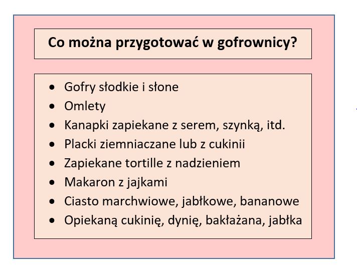 Ponadto w gofrownicy da się z powodzeniem „grillować” dynię, jabłka i cukinię, zapiekać kanapki z tostowego chleba czy nawet przygotowywać placki ziemniaczane. Jeśli jesteś więc szczęśliwym właścicielem pomysłowego urządzenia, nie wahaj się wykorzystywać go częściej niż tylko do przygotowywania gofrów!