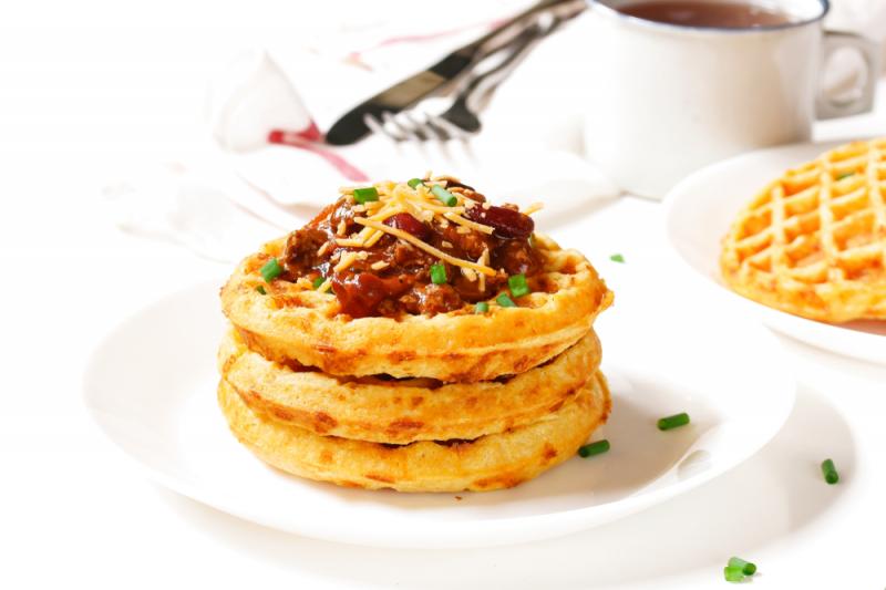 W misie połącz wszystkie suche składniki. Dodaj mleko, olej, jajka i wymieszaj, dokładnie, ale nieprzesadnie. Na natłuszczonej gofrownicy piecz gofry przez ok. 5 minut. Podawaj z sosem mięsnym typu chili, śmietaną i szczypiorkiem. (źródło: https://tastesbetterfromscratch.com/)