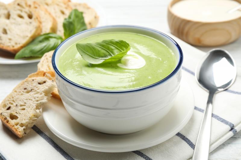 Na oliwie z oliwek podsmaż pora, następnie przypraw go solą i pieprzem do smaku. Po ok. 5 minutach dodaj rozgnieciony czosnek i smaż jeszcze 30 sekund. W mikserze połącz pora, startą cukinię, nasiona konopi, miso i sok z cytryny. Zmiksuj na gładką masę, a następnie dodaj sól, pieprz i bazylię. Miksuj dalej dodając stopniowo wodę. Podawaj z grzankami. (źródło: https://www.loveandlemons.com/)