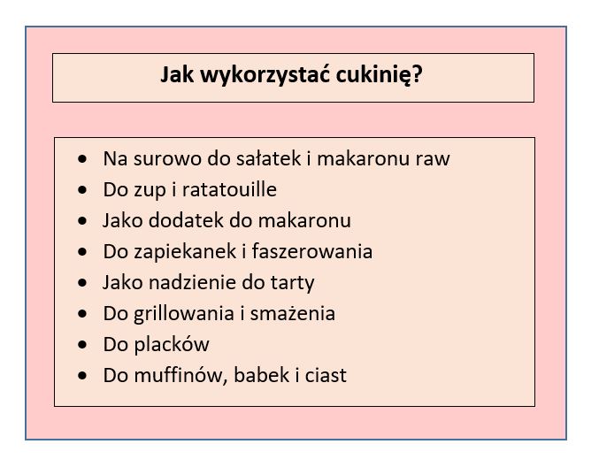 Warto pamiętać, że duże cukinie najlepiej jest wykorzystywać do zup, zapiekanek i ciast, gdzie nie zależy nam na zachowaniu konsystencji warzywa. Te mniejsze, to najbardziej cenione przysmaki, które idealnie nadają się na grilla czy do smażenia, a bardzo często przyrządza się je wraz z kwiatami!