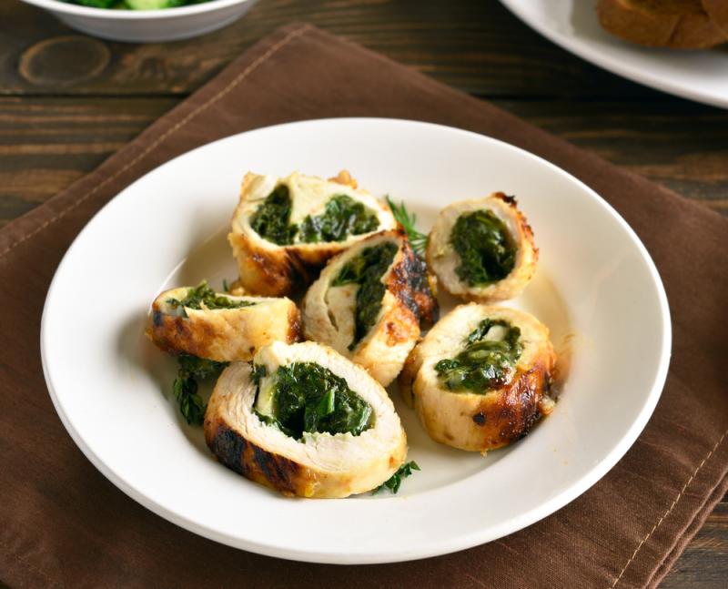 Filety rozbijamy do grubości ok. 5 mm. Na każdy wykładamy szpinak oraz ser, zwijamy w roladkę i przebijamy wykałaczką. Masło rozpuszczamy w mikrofali. Każdą roladkę obtaczamy w maśle, a potem w bułce tartej. Wykładamy do natłuszczonego naczynia żaroodpornego i pieczemy ok. 30 minut w temperaturze 180 stopni C. (źródło: https://www.tasteofhome.com/)
