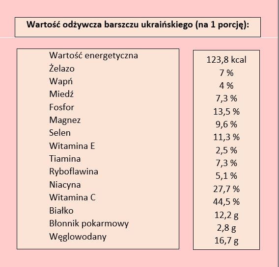 W związku z tym, że w barszczu ukraińskim znajduje się wiele warzyw, danie to bogate jest w cenne składniki odżywcze. W zdrowotnym składzie barszczu znajdziemy takie sole mineralne jak cynk, fosfor, magnez, mangan, miedź, potas, sód, wapń czy żelazo oraz witaminy A, C, E oraz witaminy z grupy B (witamina B1, B2 i B3). Miedź zapobiega powstawaniu chorób kości i nerek, dba o prawidłową pracę mózgu oraz zwiększa odporność. Fosfor warunkuje prawidłowa pracę nerek oraz niweluje bóle stawów. Cynk dba o układ odpornościowy oraz poprawia stan włosów i paznokci. Potas sprawuje kontrolę nad pracą naszych mięśni oraz umożliwia generowanie impulsów elektrycznych w komórkach naszego ciała, w tym w komórkach mięśni serca. Wapń stanowi podstawę tkanki łącznej, kości i zębów. Bierze udział w krzepnięciu krwi, regulacji niektórych hormonów, skurczu mięśni szkieletowych i serca, przewodzi impulsy nerwowe oraz dzieli i regeneruje komórki. Magnez to istotny budulec tkanki kostnej oraz dba o utrzymanie odpowiedniego ciśnienia krwi. Wpływa także na pracę serca zmniejszając ryzyko choroby niedokrwiennej i arytmii.
