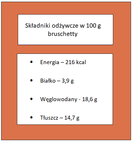 Bruschetta to źródło wielu witamin i składników odżywczych. Używając do stworzenia bruschetty pieczywa pełnoziarnistego dostarczasz swojemu organizmowi błonnik, który pozytywnie wpływa na trawienie. Kolejnym składnikiem bruschetty jest oliwa z oliwek, która obniża poziom ‘’złego’’ cholesterolu oraz zawiera witaminy E i K, a także przeciwutleniające beta karoteny.
