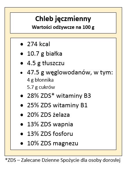 Sam chleb jęczmienny oprócz beta-glukanów zawiera pokaźne ilości nierozpuszczalnego błonnika, nieco białka, sporo witamin z grupy B, a także kluczowe dla zdrowia minerały: żelazo, wapń, magnez oraz fosfor. Jest to pieczywo szczególnie polecane w profilaktyce chorób serca, cukrzycy i otyłości, ale niebezpieczne dla alergików – zawiera bowiem gluten.