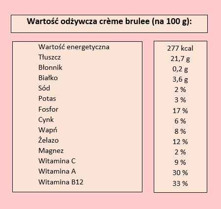 Tak naprawdę deser ten nie posiada zbyt dużo wartości odżywczych. Wszystkie witaminy i minerały pochodzą od żółtek jaj, które są jednym z głównych składników crème brulee. Są one znakomitym źródłem wielonasyconych kwasów tłuszczowych. W tym francuskim smakołyku znajdziemy białko, tłuszcze, węglowodany, błonnik, cukry, witaminy – witamina A, witaminy z grupy B (przede wszystkim witaminy B2 i B12) i witamina C. oraz minerały – cynk, fosfor, magnez, potas, sód, wapń i żelazo