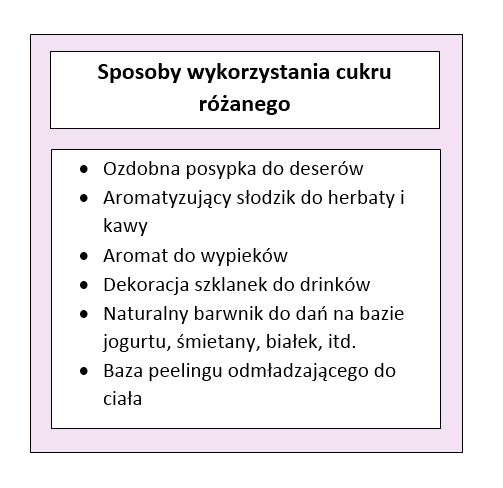 Wreszcie, różowe kryształki mogą być prawdziwą ozdobą słodkich dań. Wysypane na wierzch tortu posmarowanego białym kremem, budyniu waniliowego czy ciasteczek pokrytych lukrem, dają przyjemny efekt rustykalnej dekadencji. Uroczo prezentują się również szklanki, których brzegi zwilżymy wodą i umaczamy w cukrze różanym.