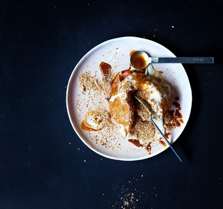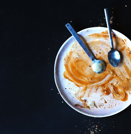 Kiedy już mamy przygotowane wszystkie składowe dania na talerz wysypujemy migdałowy proszek, układamy jabłko, bitą śmietankę kokosową, a całość polewamy sosem karmelowym.
