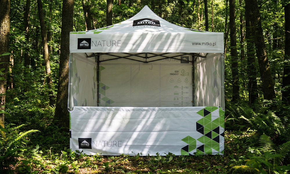 MITKO jako jedna z pierwszych firm w Polsce dała możliwość tworzenia w pełni ekologicznych namiotów reklamowych, korzystając z tkanin z recyklingu i naturalnych materiałów. Na przykład, do produkcji namiotu reklamowego o wymiarach 3×3 m z kolekcji Nature, potrzebnych jest aż 681 plastikowych butelek. Czyli o 681 butelek PET mniej w środowisku.