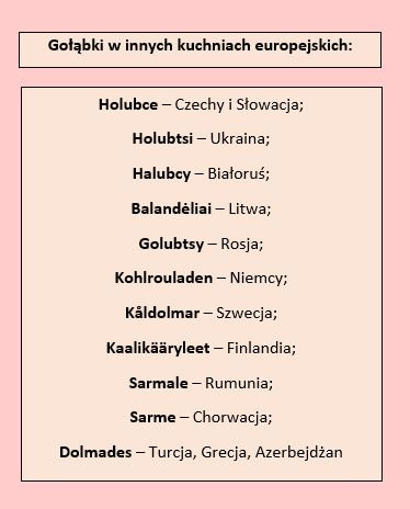 Jednak gołąbki podbiły także inne regiony Europy. Wszędzie tam, gdzie dotarła uprawa kapusty, pojawił się zwyczaj spożywania gołąbków. Poza Ukrainą i Polską, gołąbki pojawiły się także w Czechach, Rosji, Białorusi, na Słowacji i Litwie w podobnej postaci, chociaż pod inną nazwą. Grecy nieco zmodyfikowali przepis na to danie i zamiast liści kapusty, do zawijania farszu używają liści winogron. W Rumunii i Chorwacji zamiast mięsa wieprzowego może pojawiać się jagnięcina, baranina, drób lub farsz rybny. Gołąbkowa ekspansja, jako dotarła także do krajów skandynawskich: do Szwecji (kåldolma) i jako kaalikääryleet do Finlandii.