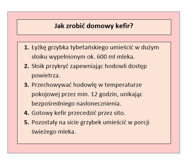 Do przygotowania domowego kefiru potrzebować będziemy dużego słoika, porcji mleka (ok. 600-700 ml) oraz łyżki ziaren kefirowych. Te ostatnie można nabyć w wyspecjalizowanych sklepach lub wziąć od znajomych, którzy produkują kefir – grzybek stale się bowiem rozmnaża i łatwo się nim dzielić z innymi.
