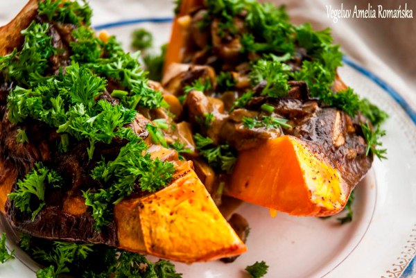 W międzyczasie usunęłam pestki i wyjęłam odrobinę miąższu – tyle, żeby zmieścił się farsz (tę resztkę miąższu też można upiec). Posypałam solą i pieprzem i włożyłam do piekarnika rozgrzanego do około 180 stopni. Kiedy farsz grzybowy był już gotowy tj. był dość gęsty, wlałam go do środka dyni. Całość piekłam około 30 minut. Warto sprawdzić wykałaczką, albo innym szpikulcem czy cała dynia jest miękka.