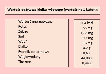 Kleik ryżowy przygotowywany jest z ryżu, czyli zboża bogatego w wiele witamin i minerałów. To przede wszystkim doskonałe źródło węglowodanów złożonych, które dostarczają nam energię. Poza tym w ryżu znajdziemy takie pierwiastki jak: cynk, magnez, potas i żelazo. Cynk określa strukturę niektórych białek, obniża poziom cholesterolu, ma wpływ na przyswajalność niektórych witamin, dba o prawidłowe funkcjonowanie narządów rozrodczych. Magnez decyduje o prawidłowej pracy układu odpornościowego i nerwowo-mięśniowego, bierze udział w budowie kości i zębów, a także zmniejsza ryzyko rozwoju nadciśnienia tętniczego. Żelazo wytwarza hemoglobinę i korzystnie wpływa na odporność. Natomiast potas odpowiedzialny jest za utrzymanie odpowiedniego napięcia elektrycznego na błonach komórkowych.