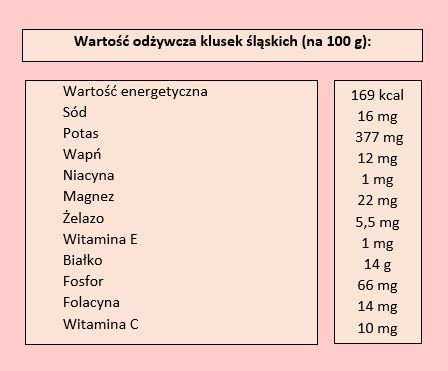 Kluski śląskie na mają skomplikowanego składu: ziemniaki, jajko i mąka ziemniaczana. W związku z tym, nie posiadają wielu zbyt cennych substancji odżywczych. Podstawowym składnikiem są wspomniane ziemniaki, które są bogate w wartościowe witaminy, minerały i makroelementy. Dostarczają stosunkowo duże ilości witamin takich jak: B1, PP, B5, B6, C, są również bogactwem składników mineralnych: cynku, fosforu, magnezu, manganu, miedzi, potasu i żelaza. Taka zawartość substancji odżywczych oznacza, że ziemniaki między innymi obniżają ciśnienie, wspomagają nasz wzrok, poprawiają stan skóry, pomagają usunąć nadmiar wody z organizmu, regulują pracę układu pokarmowego – w tym także jelit, redukują stres oraz usprawniają proces krzepnięcia krwi. Ugotowane ziemniaki wykazują działanie przeciwbólowe, a naturalne maseczki na ich bazie pomagają łagodzić poparzenia, odmrożenia oraz wspomaga walkę z trądzikiem.