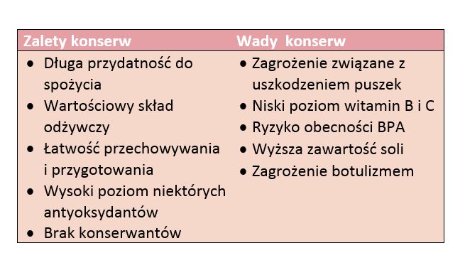 Podsumowując, nie ma żadnego istotnego powodu, aby bronić się przed konserwami. Owszem, gotowanie na bazie świeżych produktów wnosi do jadłospisu pokaźne ilości witamin z grupy B i C, których w konserwach brakuje, a także daje ciekawsze zazwyczaj efekty smakowe. Gdy brakuje czasu lub podaż świeżych warzyw, owoców czy mięsa jest ograniczona, nie ma jednak żadnych przeciwwskazań, aby sięgnąć po puszki i słoiki, które pod względem walorów odżywczych są podobne do żywności mrożonej, ale znacznie łatwiejsze w przechowywaniu.