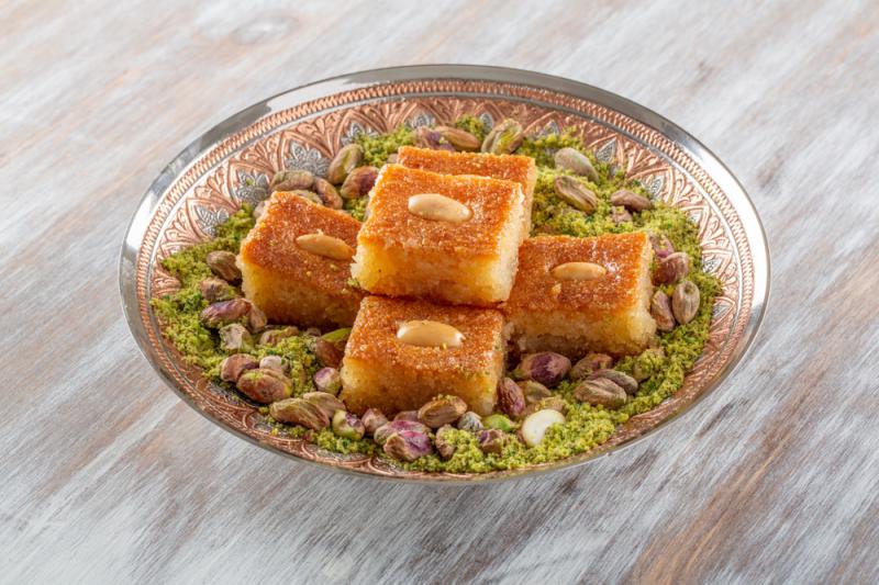 Ze słodkich dań godny uwagi jest natomiast knafeh, czyli sernik doprawiany wodą różaną lub pomarańczową; znana przede wszystkim z Turcji baklava przyrządzana z ciasto filo skąpanego w syropie lub miodzie oraz różne rodzaje chałwy (halva) czy intensywnie dosładzanych mas na bazie semoliny, orzechów lub pasty sezamowej tahini.
