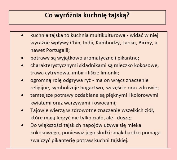 Kuchnia tajska wyróżnia się swoim smakiem, aromatem i wyglądem. Jest nieco specyficzna, bo nie każdy jest zwolennikiem ostrych potraw. A kuchnia tajska słynie z pikantnych dań. Nie mniej jednak, warto spróbować chociaż jednego dania pochodzącego z odległej i egzotycznej Tajlandii. Może jednak kuchnia tajska stanie się naszą ulubioną?