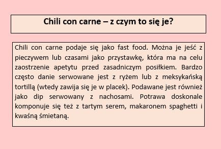 Jeśli nie macie pomysłu na szybki i smaczny obiad, możecie przyrządzić chili con carne. W zasadzie potrawa ta sama się robi, wystarczy tylko wrzucić wszystkie składniki do garnka i od czasu do czasu pomieszać. Znakomicie smakuje zarówno z ryżem, makaronem czy tortillą, jak i bez żadnych dodatków. Poza tym, że jest danie to jest pyszne, to także dostarcza naszemu organizmowi cennych składników mineralnych.