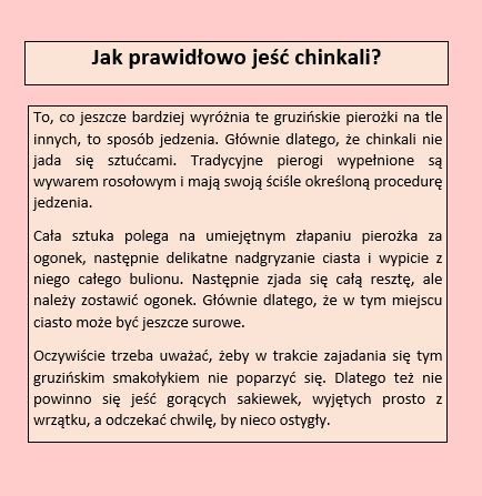 To, co również nadaje im wyjątkowości, to sposób jedzenia chinkali. Spożywając je, trzeba obejść się bez sztućców, co na początku sztuka ta może być trudna do opanowania. Wszystko dlatego, żeby rosołek nie rozlał się po talerzu – trzeba go najpierw wypić, a dopiero potem zjeść pozostałą zawartość.