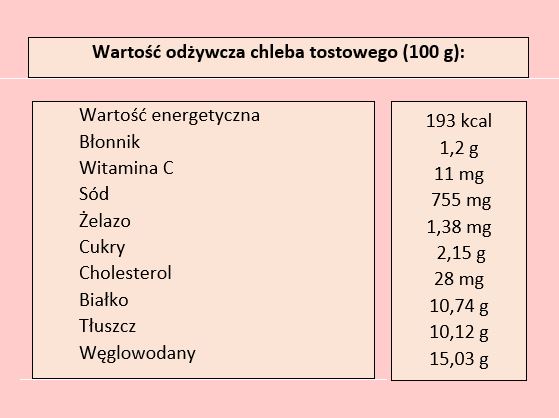 Podstawowymi składnikami chleba tostowego są mąka (zazwyczaj pszenna) woda, drożdże, sól, cukier oraz tłuszcze. Składniki te nie powinny wzbudzać zaniepokojenia. Jednak w sklepowym pieczywie tostowym pojawiają się inne dodatki, zazwyczaj to chemiczne ulepszacze smaku, wyglądu i zapachu. Są to wszelkiego rodzaju emulgatory, regulatory kwasowości, tłuszcze trans, substancje chemiczne zapobiegające pleśnieniu produktu oraz wydłużające jego datę przydatności. Poza tym, w kupnym chlebie tostowym znajdują się niskiej wartości składniki, takie jak mąka pszenna pozbawiona wszelkich substancji odżywczych. Nie są to dodatki, które korzystnie wpływają na nasze zdrowie. Chleb tostowy to także puste kalorie dostarczane do organizmu.