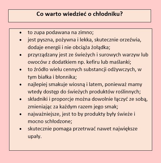 Chłodnik to zupa serwowana na zimno. To specyficzna potrawa, przyrządzana jest ze świeżych i zazwyczaj surowych warzyw lub owoców, z dodatkiem np. kefiru lub maślanki. Chłodnik jest idealną zupą na lato, gdy żar się leje z nieba, a my nie mamy ani apetytu, ani ochoty na wykwintne gotowanie, a coś jednak musimy w ciągu dnia spożywać. Jest łatwa i szybka w przygotowaniu, co jest jej dodatkowym plusem. To pyszna, pożywna i lekka zupa, która skutecznie orzeźwi, doda energii i nie obciąży żołądka. Poza tym chłodnik to źródło wielu cennych substancji odżywczych, w tym białka i błonnika. Chłodniki skutecznie pomagają przetrwać nawet największe upały.