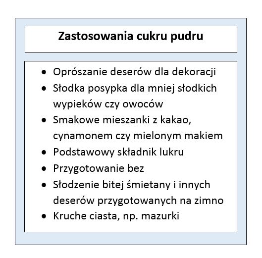 Podsumowując, cukier puder jest wynalazkiem genialnym w swojej prostocie. Zawsze warto mieć go w domu, bo w wielu smakołyków udaje się lepiej z miałką konsystencją pudru – jak choćby kruche ciasta i ciasteczka. Jedyna rzecz, przed którą warto przestrzec, to nadgorliwość w słodzeniu. Jeśli więc planujesz oprószyć wypiek elegancką białą warstewką, pomyśl o zdrowiu i zmniejsz ilość cukru dodawaną do ciasta!