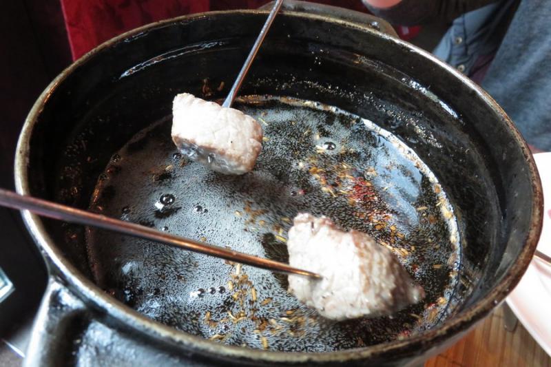 - Fondue chińskim – obejmującym kociołek z wywarem, w którym zanurza się kawałki mięsa oraz warzyw.