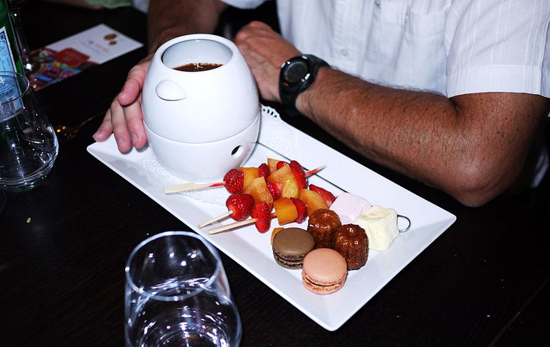 - Fondue czekoladowym – słodkiej interpretacji fondue, która polega na połączeniu śmietanki z czekoladą. W stopionej masie macza się następnie kawałki owoców.